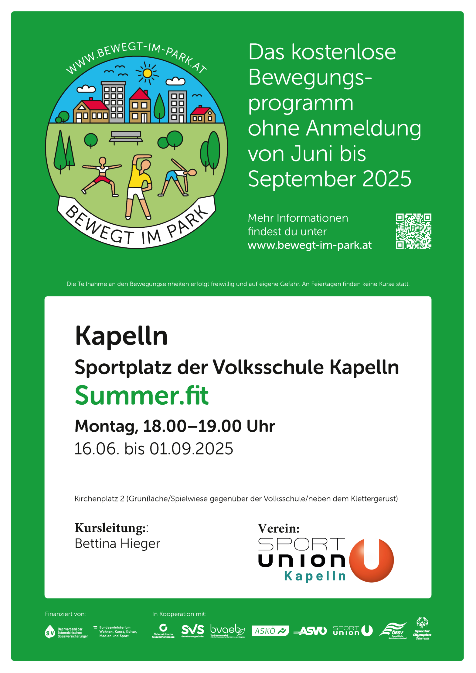 Summer.fit in Kapelln ist ein kostenloses Ganzkörpertraining im Rahmen der österreichweiten Initiative Bewegt im Park.Es kombiniert Kraft, Ausdauer und Koordination mit funktionellem Training, bei dem mehrere Muskelgruppen gleichzeitig aktiviert werden.Alle Übungen werden in verschiedenen Schwierigkeitsgraden angeboten, sodass sowohl Anfänger:innen als auch Fortgeschrittene teilnehmen können.